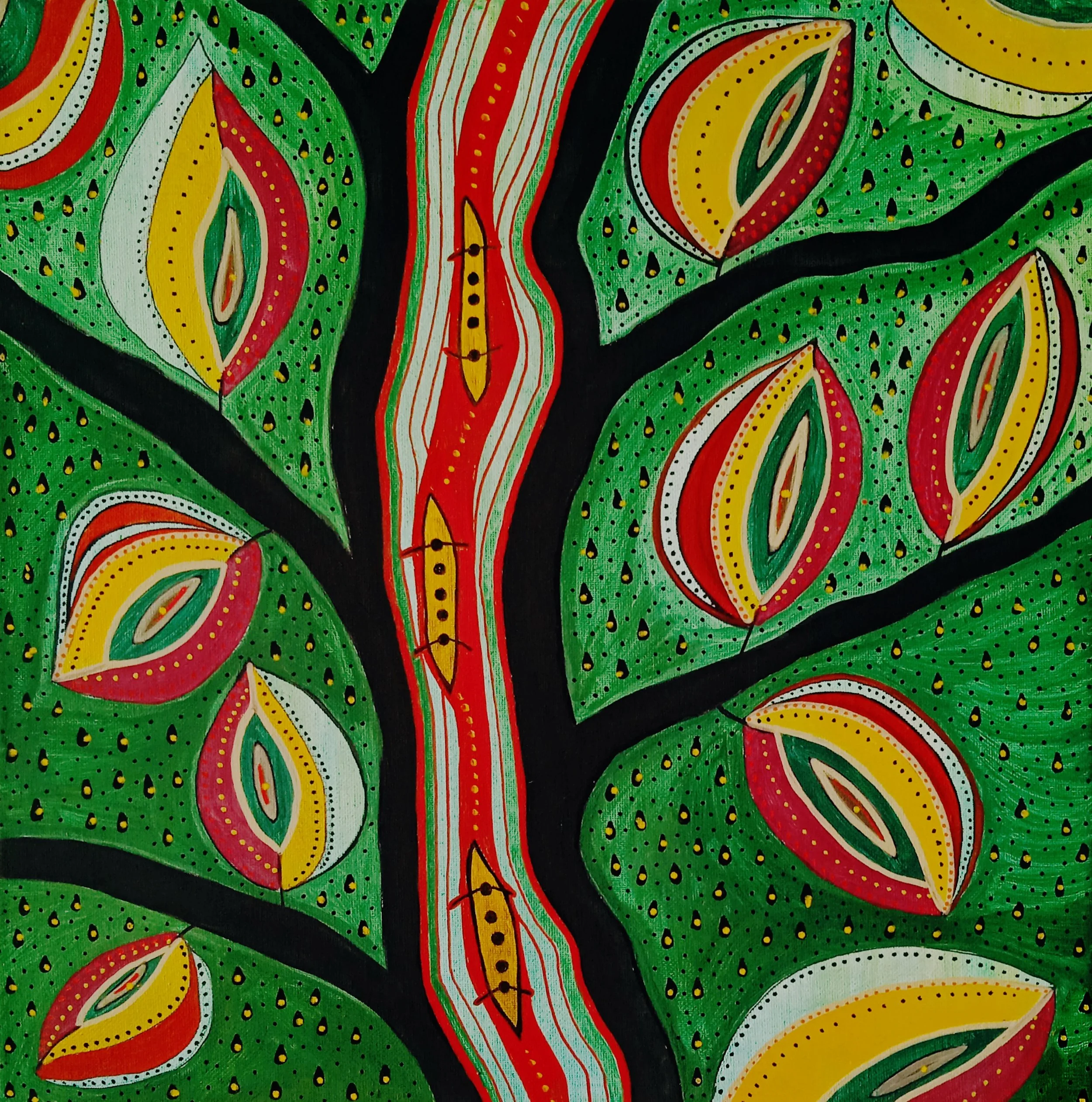 Today, working from her home studio, she employs acrylics, watercolors, gouache, and oils, along with natural elements. Her palette is both earthy and vibrant: ochres and browns root her work to the land, while vital eruptions of green, red, and yellow bring energy. Deep blues open space for the symbolic, and black runs through her pieces like a score of visual music—not closing, but structuring.