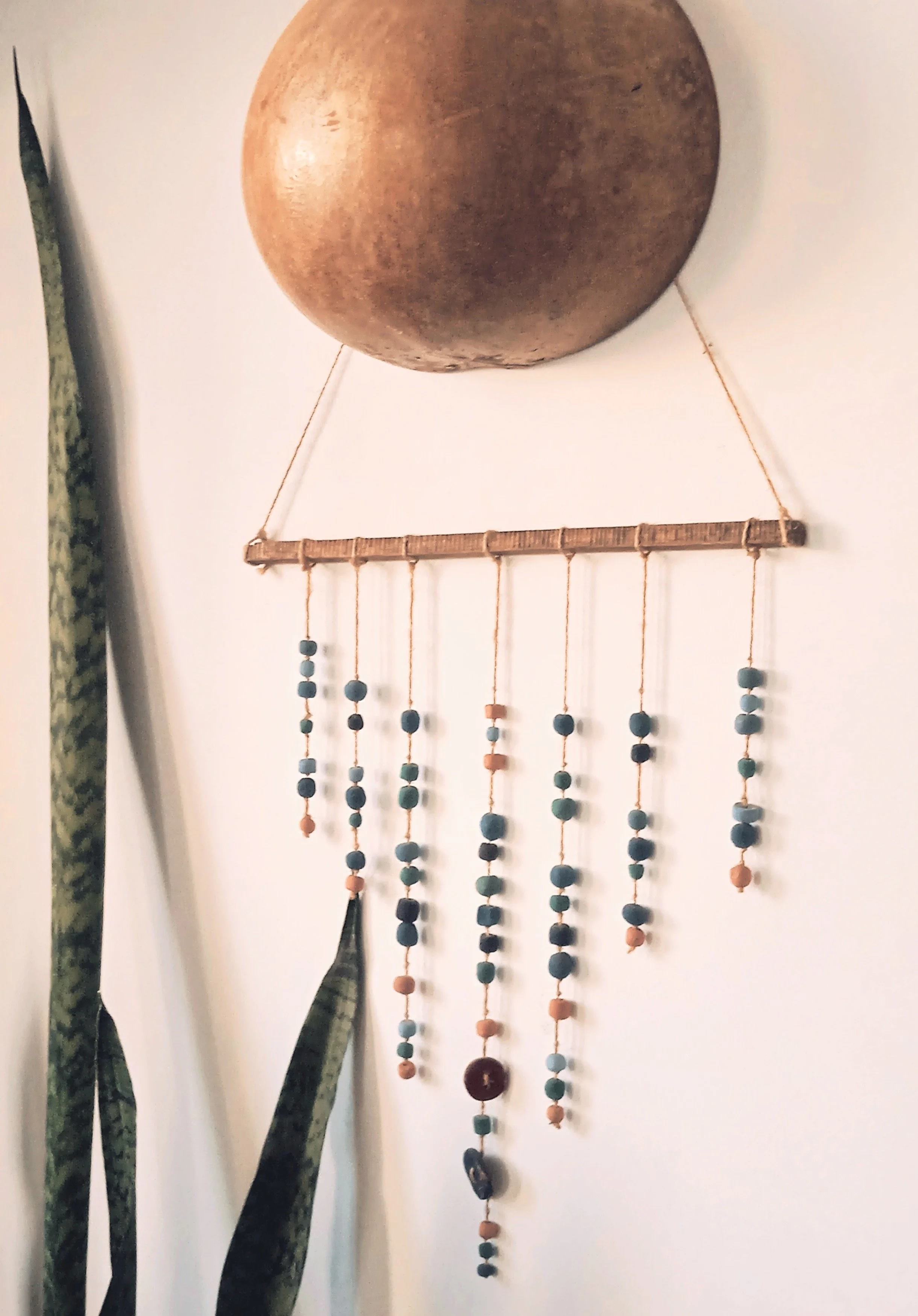 mini balls and button shapes in painted air-dry clay mounted on white cotton thread on a wooden stick and hung with hemp thread