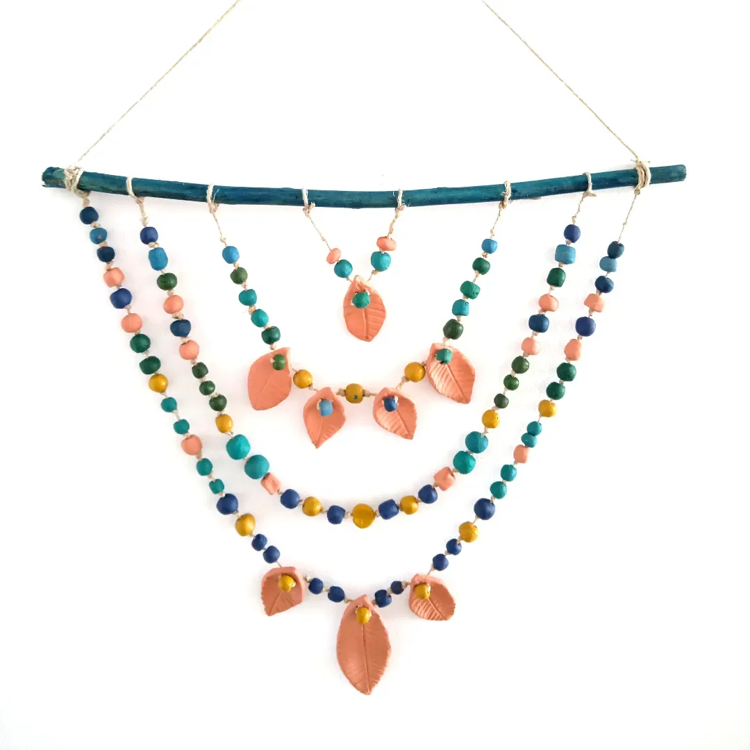 mini balls and leaf shapes in painted air-dry clay mounted on white cotton thread on a wooden stick painted in blue and hung with hemp thread