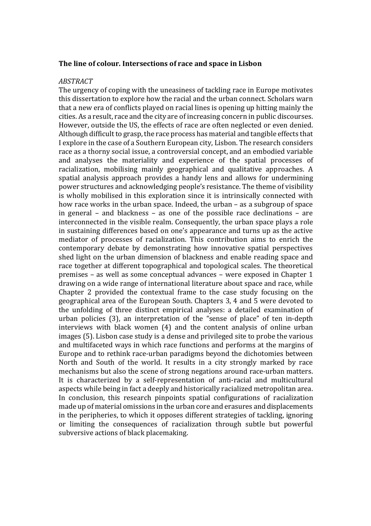 The line of colour. Intersections of race and space in Lisbon2022Monograph for the PhD degree in Urban Studies and Regional Science, GSSISPS/10